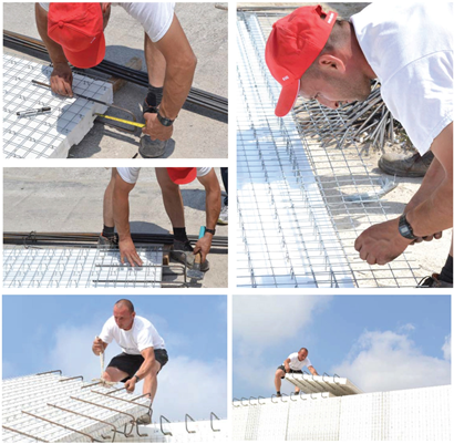 The EVG-3D construction systems can be built on any foundation, subject to starter bars cast into the foundation according to structural engineering requirements. The panels are usually placed so that the rebar is set between the mesh and the polystyrene. This ensures easy and precise wall alignment. A damp proof layer is applied under the wall panel.