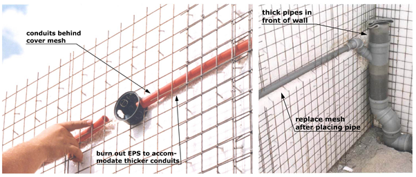 Another great feature of this system is the way it accommodates utilities. Once panels are secured in place, all services are passed between the reinforcing mesh and polystyrene. In order to increase this space, a propane torch or heat gun may be used to melt the polystyrene, which in itself is self-extinguishing.