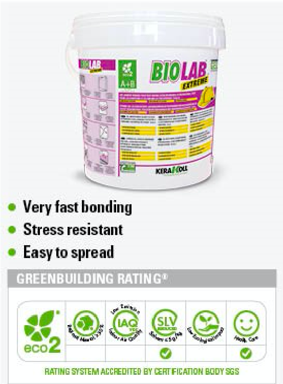 BIOLAB is a high performance and structural tile adhesive gels. BIOLAB NO LIMITS and BIOLAB EXTREME are the new generation of multi-purpose adhesive gels for bonding all material types and formats to all substrates, that can weather extreme conditions. Applicable for large format gres tiles, marble cladding and much more.